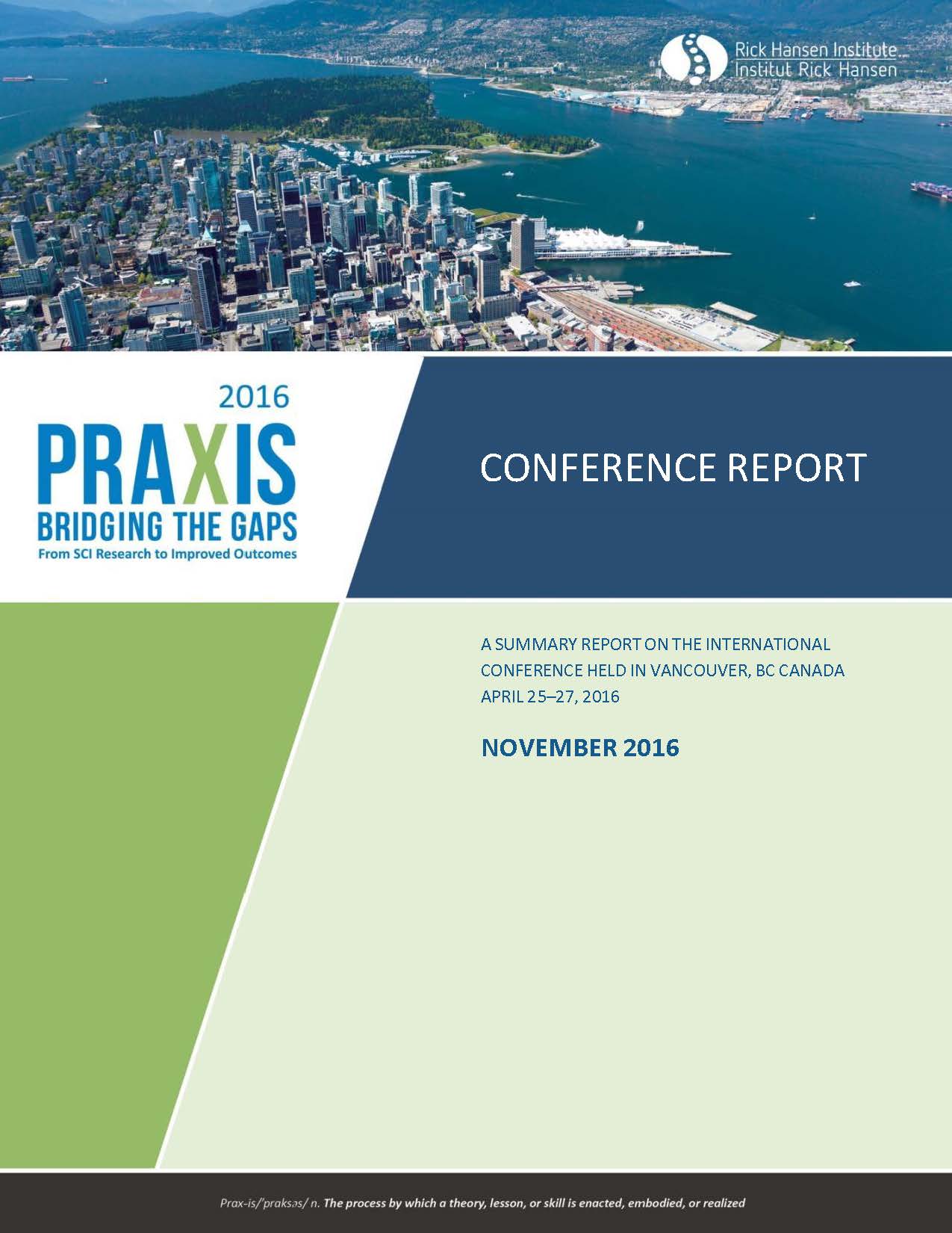The Praxis 2016 conference was hosted by the Praxis Spinal Cord Institute (previously known as the Rick Hansen Institute) in Vancouver, British Columbia, Canada from April 25 to 27, 2016